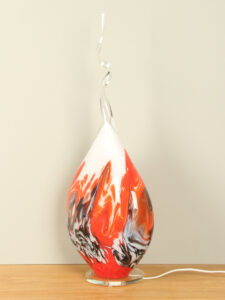 Dies ist eine mundgeblasene Lampe des Künstlers Arno France. Diese besondere Leuchte wird im Glasatelier von Bruno Lehrer hergestellt. Die Leuchte besteht aus einer großen mundgeblasenen Glasskulptur in helle Farben und einem Sockel mit einem Durchmesser von 15 cm aus Kristallglas mit Fassung. Sie erhalten die Lampe inklusive LED-Lampe.